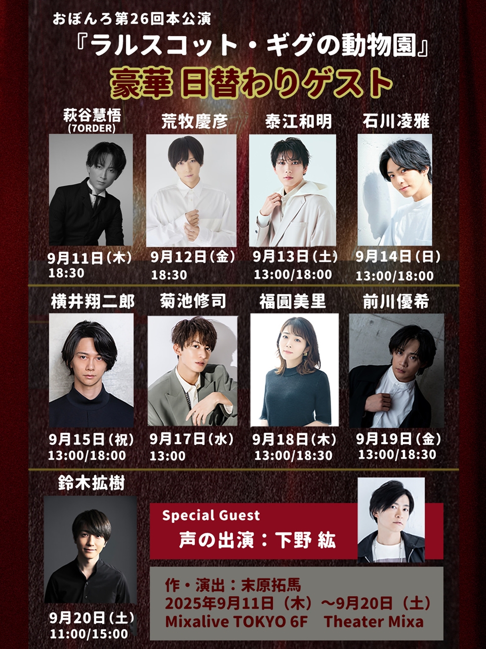 そして物語の鍵を握るカラス役には、萩谷慧悟(7ORDER)、荒牧慶彦、泰江和明、石川凌雅、横井翔二郎、菊池修司、福圓美里、前川優希、鈴木拡樹(出演日程順)という豪華俳優陣が日替わりゲストとして出演します。