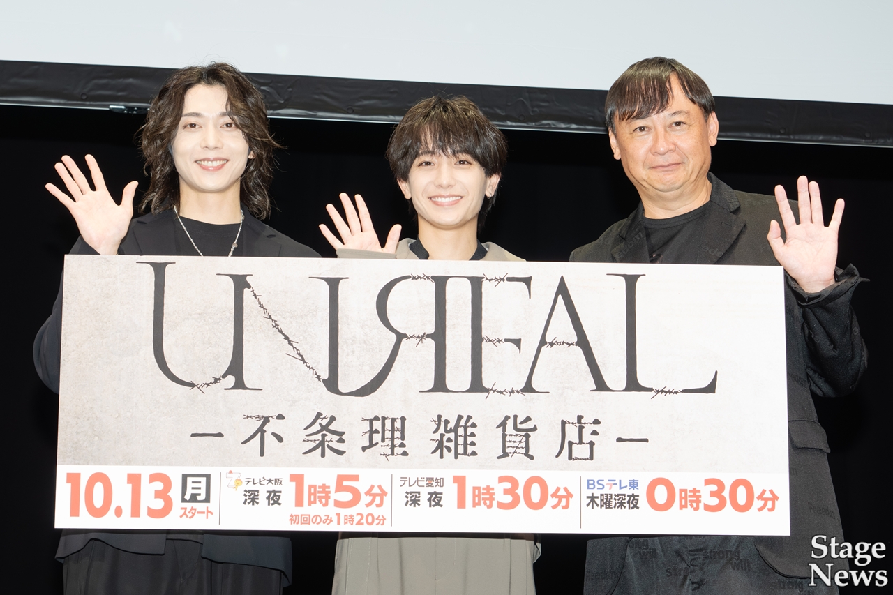 放送に先立ち、ドラマ×舞台連動企画「UNREAL-不条理雑貨店-」完成記念イベントが都内にて実施され、怪しげなアンティーク雑貨店「UNREAL」の店主で、ミステリアスな男・ヤギオ役:染谷俊之、近くのカフェで働き、ヤギオの世話を焼く高校生・濱家宗哉〈ムネチカ〉役:小西詠斗、そして監督の橋本一が登壇し、本作の魅力を語った。