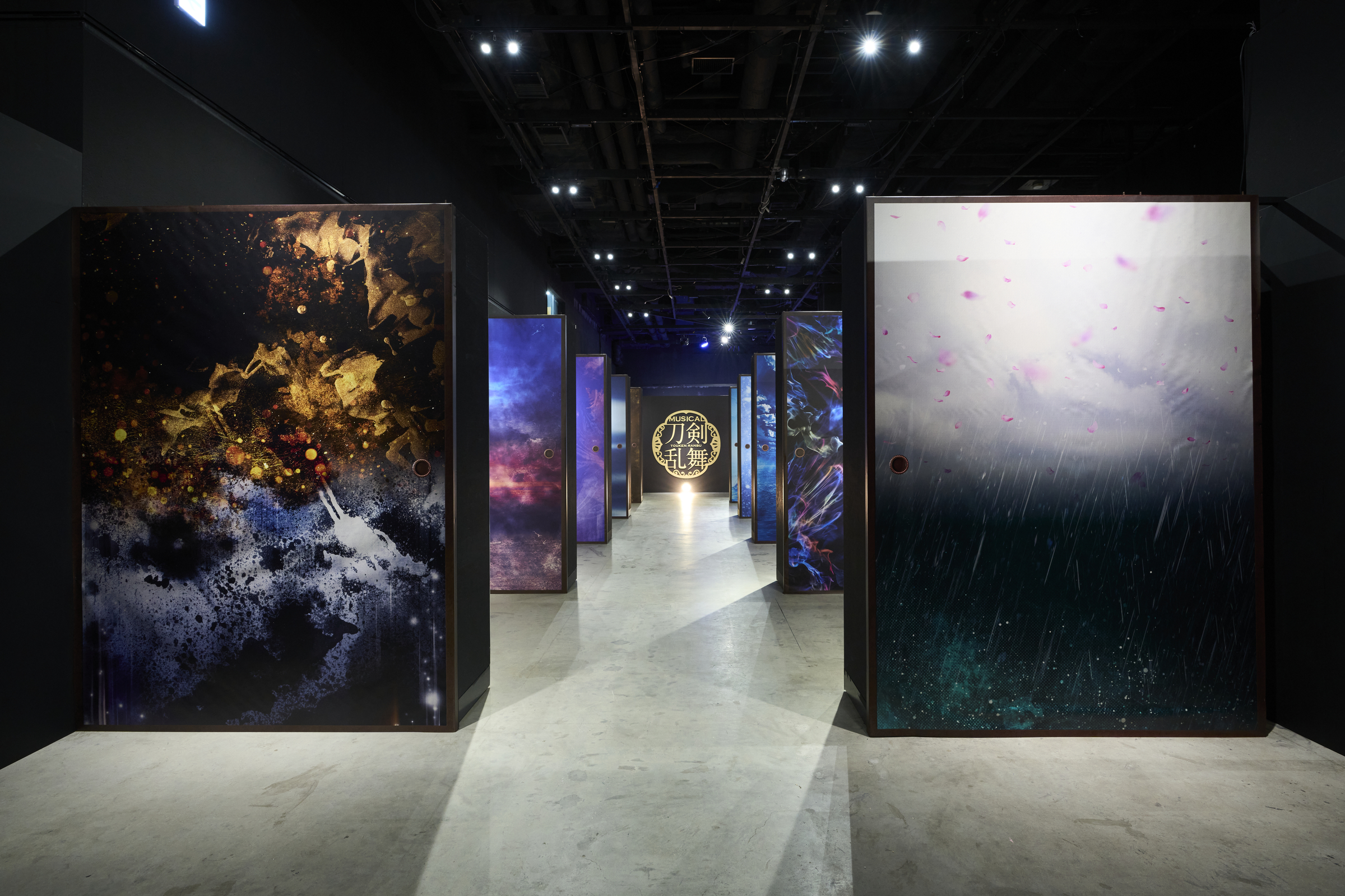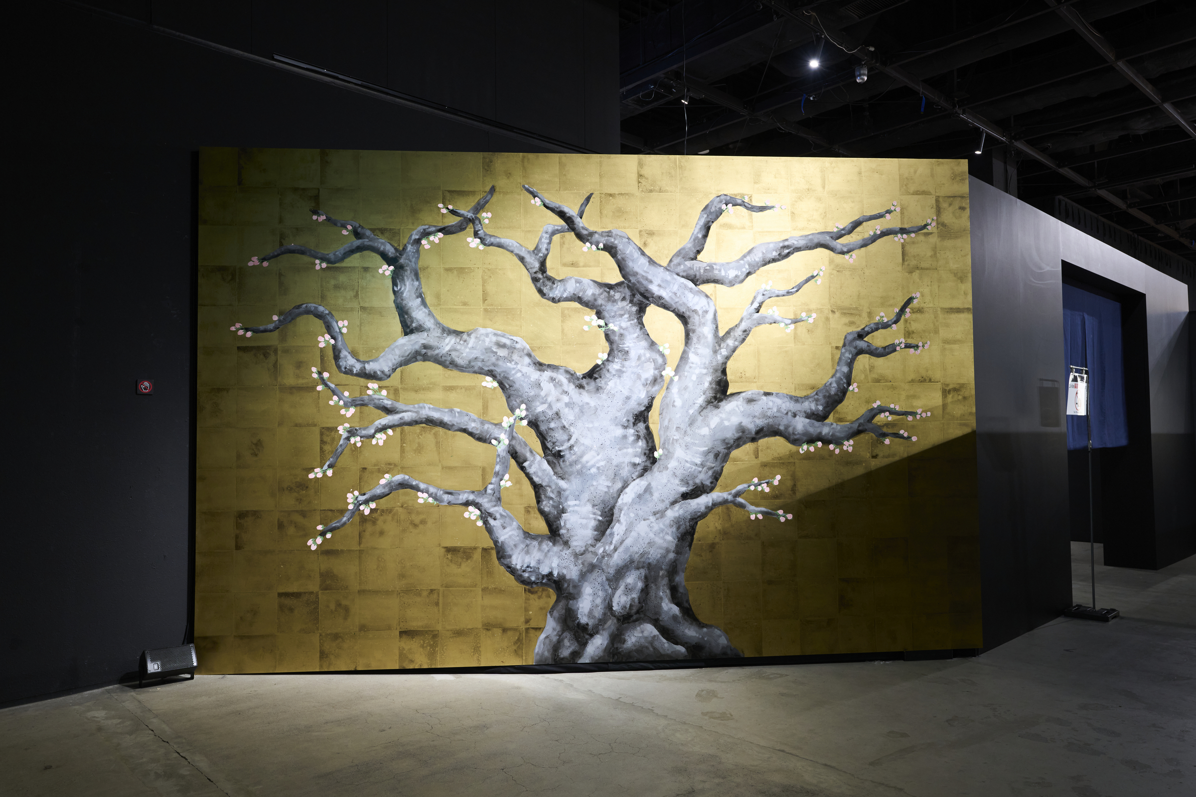 展示エリアのはじめには、1本の桜の木――その先へ進むと、本イベントのビジュアルと同じく、過去十年のミュージカル本公演メインビジュアルの意匠を施した襖の間が広がっています。
