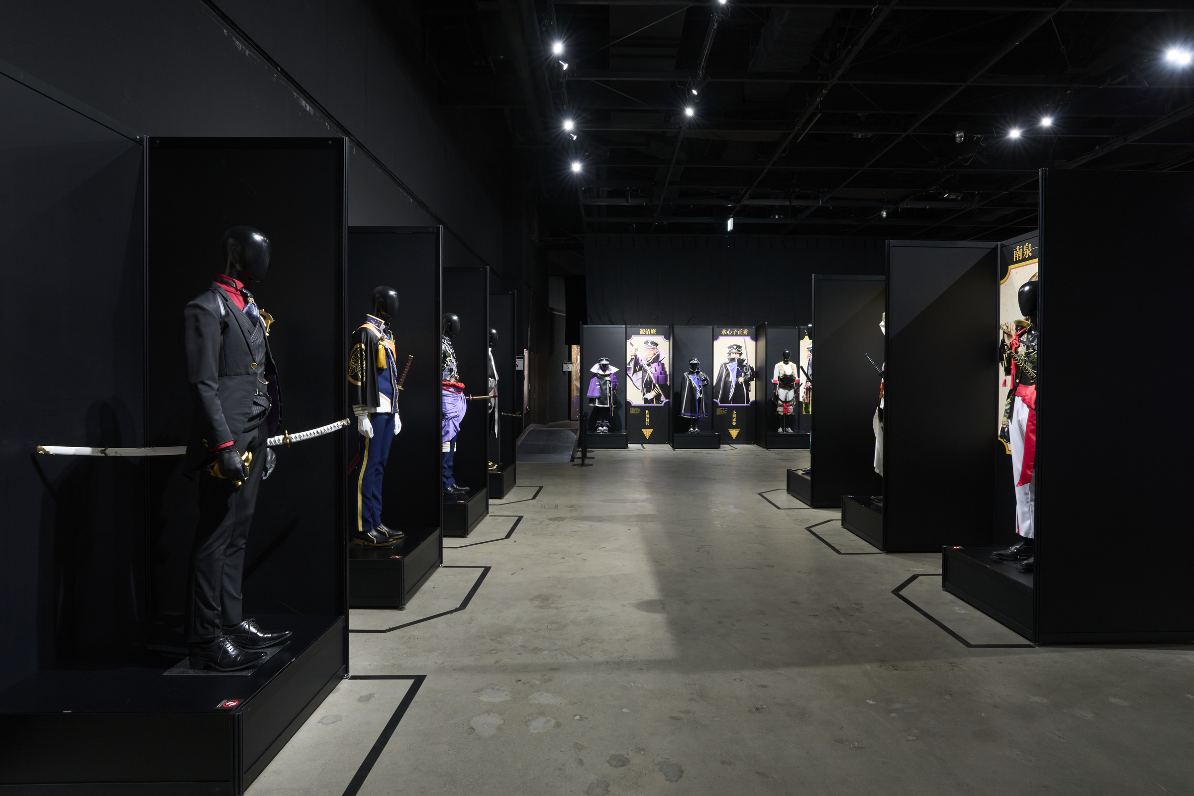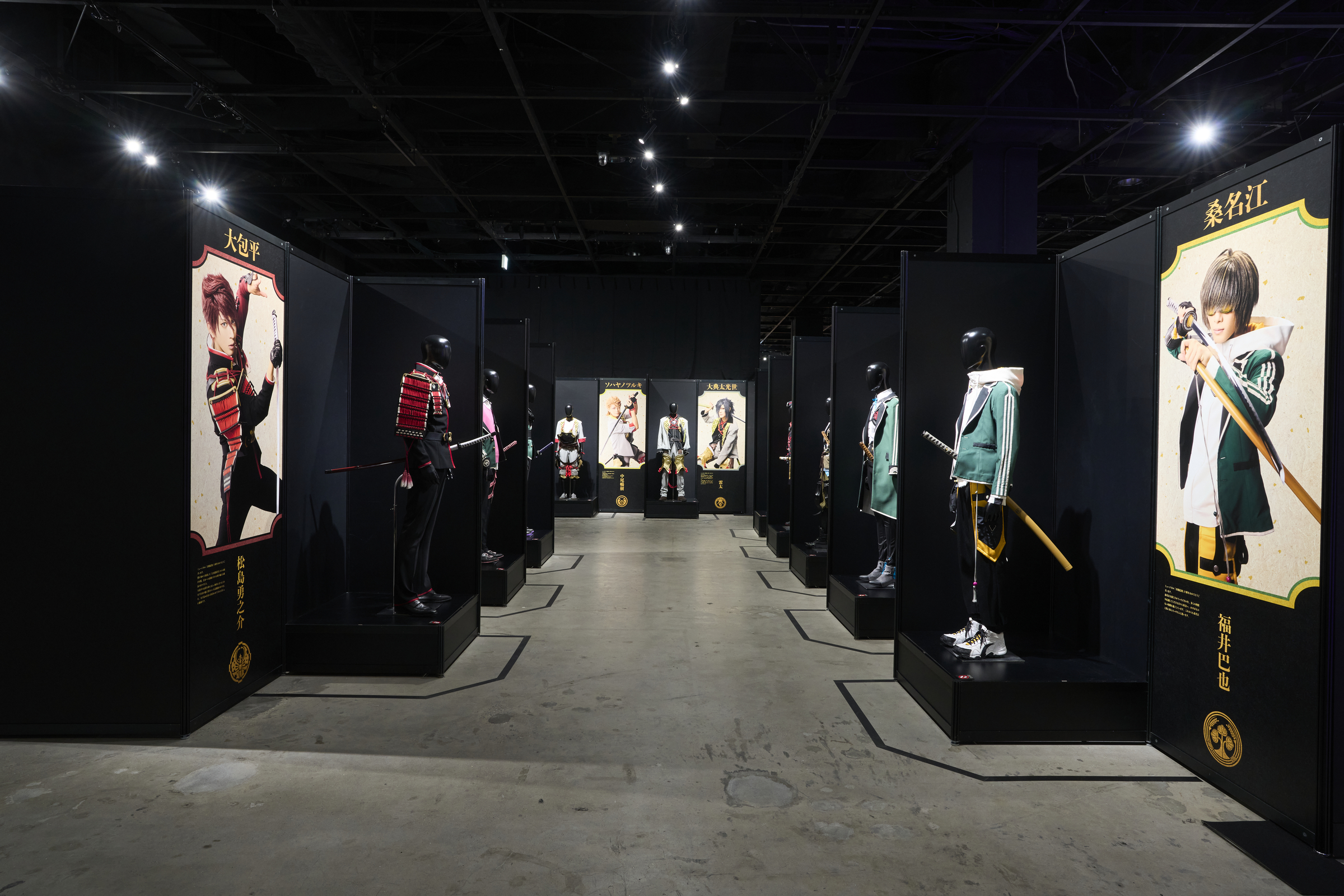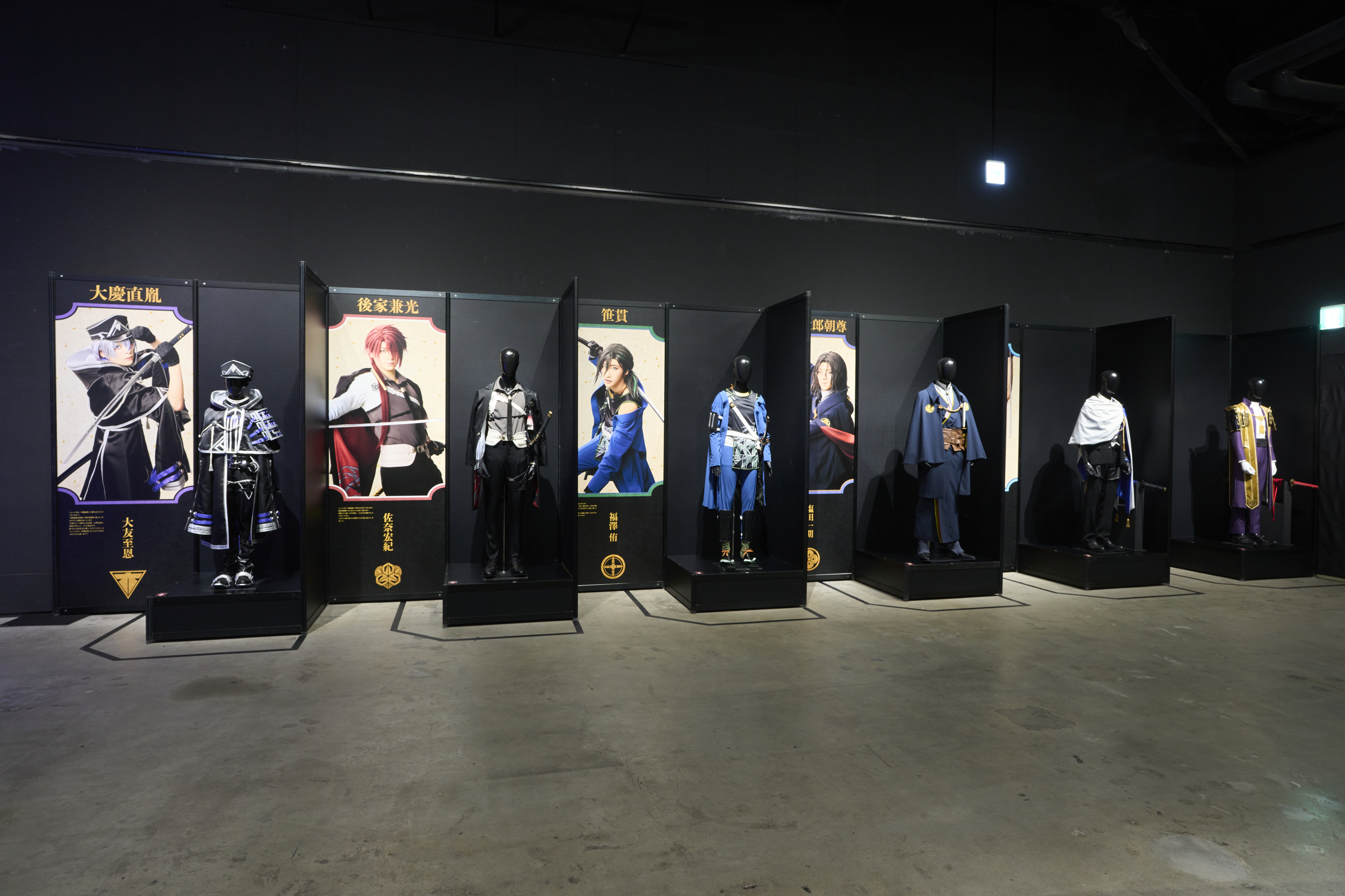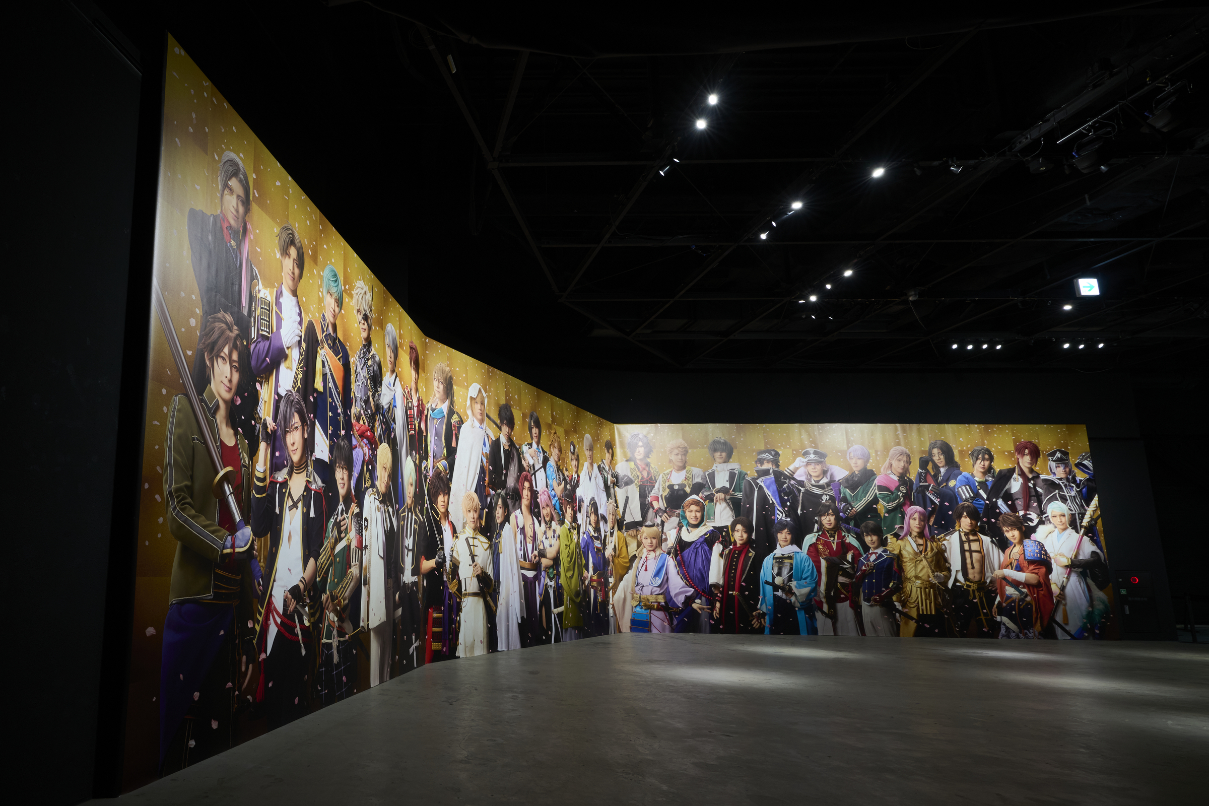 展示エリアの終わりは、壁面を埋め尽くす刀剣男士48振りのビジュアル。等身大を遥かに超える特大ビジュアルの迫力を、是非、間近でお楽しみください。