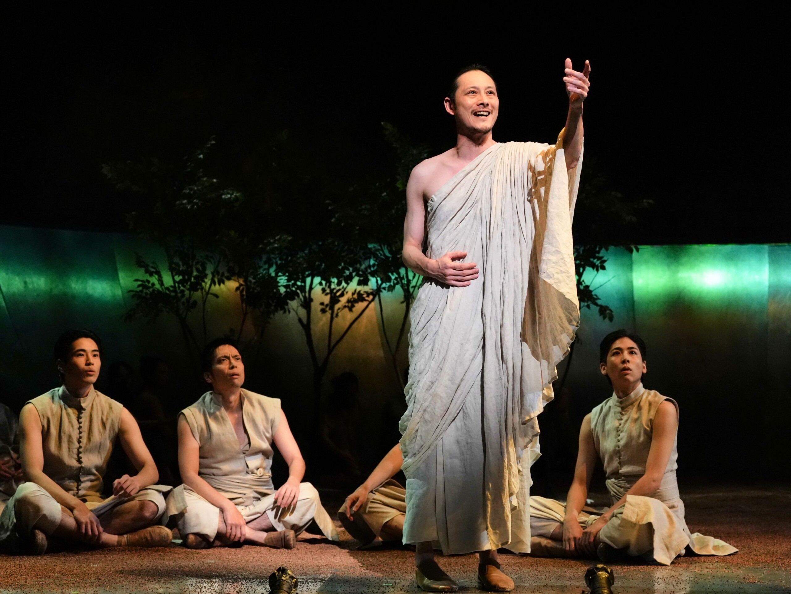 長田育恵(劇作)×白井晃(演出)×三宅純(音楽)、そして草彅剛主演の舞台『シッダールタ』が11月15日(土)に開幕した。原作はヘルマン・ヘッセの傑作小説。叙事詩的/哲学的な力強い言葉、時空を超えて古代インドに誘われるような音楽、美術・照明・音響さまざまな要素が有機的につながる劇空間――。一人の男の魂の遍歴を描いた壮大な物語が鮮やかに立ち上がった、最終舞台稽古のレポートを送る。