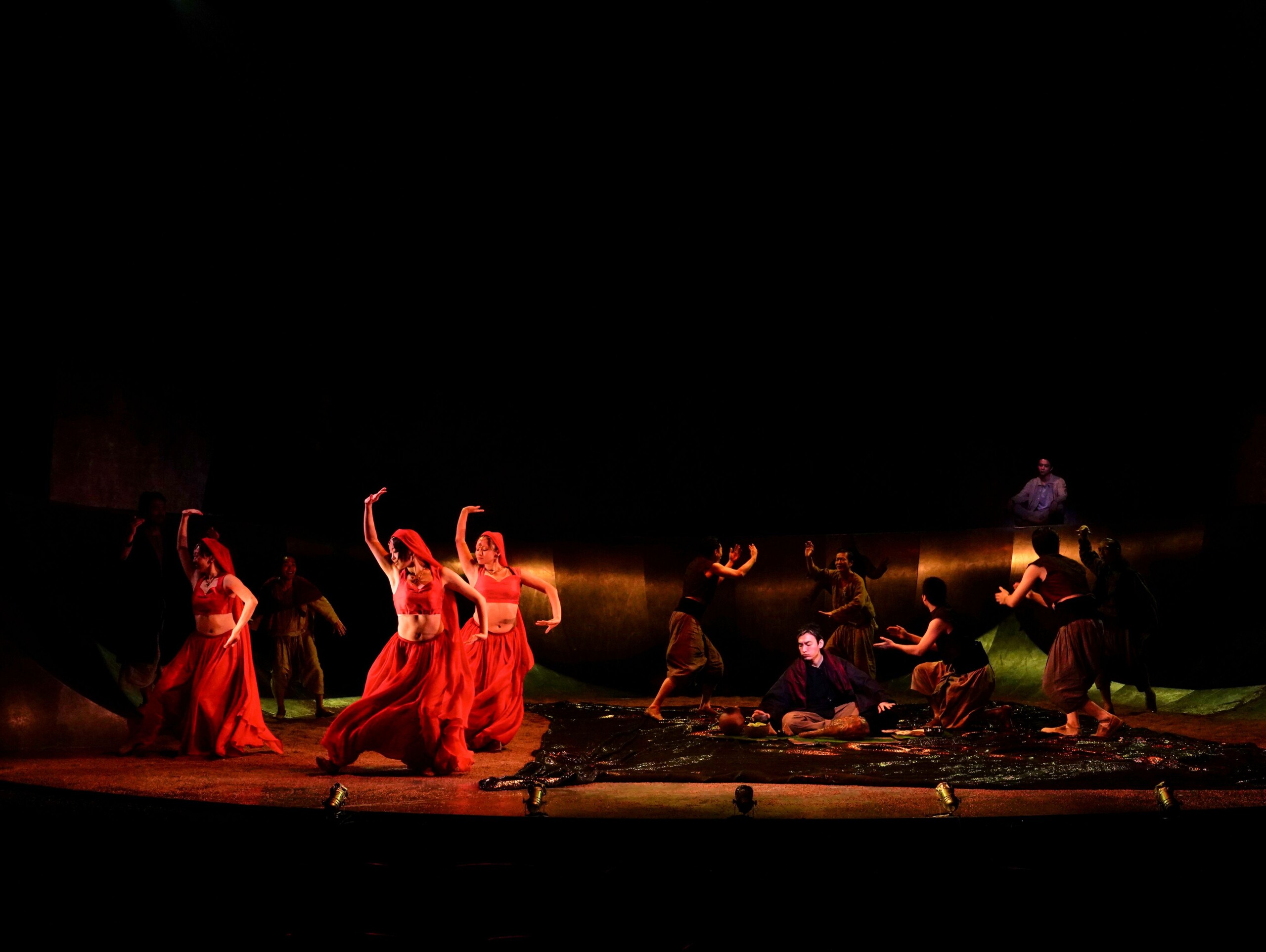シッダールタが出会いと別れを繰り返しながら旅を続ける物語は、驚くほどにシンプルである。劇場に入ってまず目に入るのは、天井から突き出して光を放つLED照明、大きな穴の中で展開するような舞台美術だろう。役者たちは上段から滑り台のように下段に降りてきたり、一挙に駆け上がったりしながら、自在に舞台を駆け巡りながら演技をする。美術は時にスクリーンとなり、投射される映像に合わせてダンサーたちがしなやかな動物となって駆け抜けていく躍動的な美しさ! モダンな舞台空間に沙羅双樹の森、野生的な生命が宿っていくようだった。床に敷かれた砂が役者たちの動きによって散らされ、刻々と表情を変化させていく様も面白い。