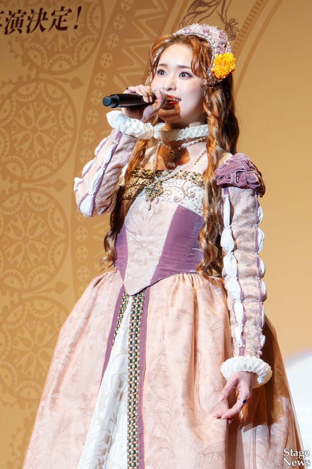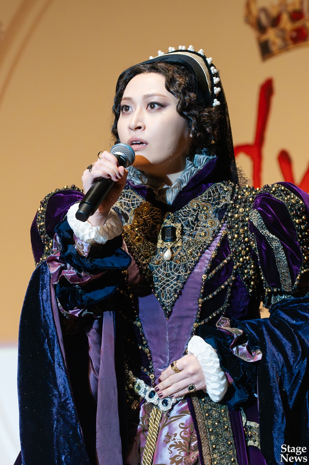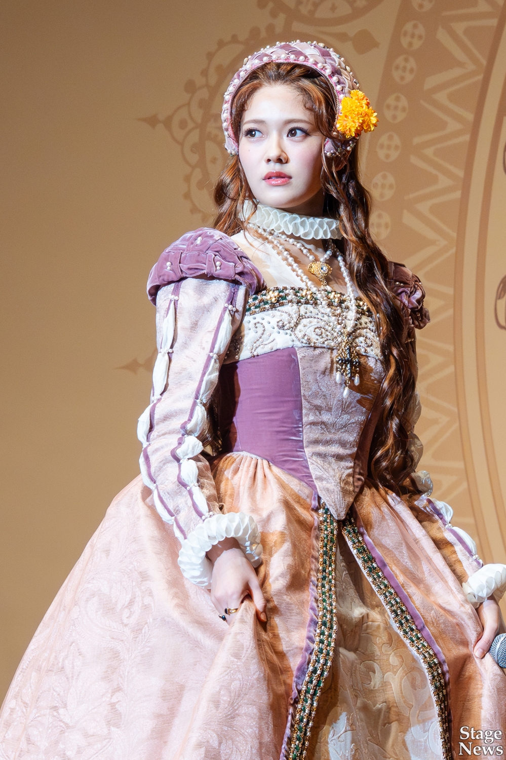 小南満佑子:グランドミュージカルの初主演、初座長ということで、この日を迎えるのが本当に緊張してドキドキしていましたが、こうして皆さんにお披露目することができて嬉しいですし、初演を作り上げたスタッフの皆様や、いつもお世話になっている先輩方が作ってきた作品を引き継ぐかたちで出演させていただけることが、本当に何よりも喜びと感謝の気持ちでいっぱいです。本日たくさんの皆様が集まってくださり、いかにこの作品が多くの方の心に響き愛されているのかを改めて感じております。今回出演のお話を頂いたとき、エリザベス女王という人物を知ろうと思い、書籍や映画などでできるだけ勉強しました。本当に波乱万丈な人生を送られていて、私に務まるだろうかという不安もございましたが、学んでいくうちに、この人の人生を生きたいと強く願ったのが印象的でした。デビューしてからいろんな作品を通して、スタッフの方に支えてもらい、先輩方に導いていただきました。本当に感謝の気持ちでいっぱいですし、ご縁を繋いでくださった小池先生に感謝していますし、何よりもお客様に恩返しをすることができたらという思いで務めていきたいです。2026年、ミュージカル『レイディ・ベス』を劇場で体感していただけたらと思います。