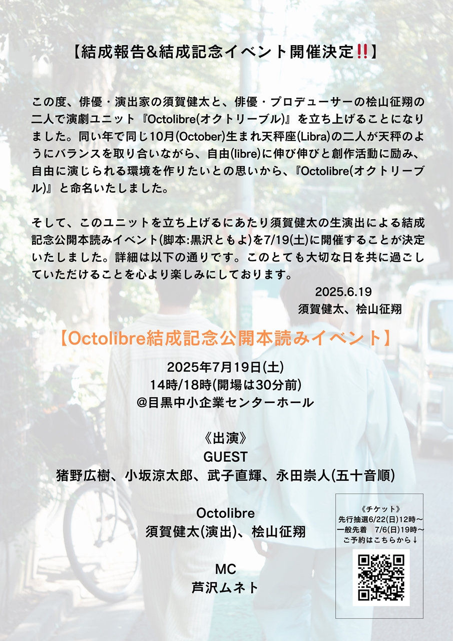 俳優・演出家の須賀健太と、俳優・プロデューサーの桧山征翔が、演劇ユニット『Octolibre(オクトリーブル)』を結成。