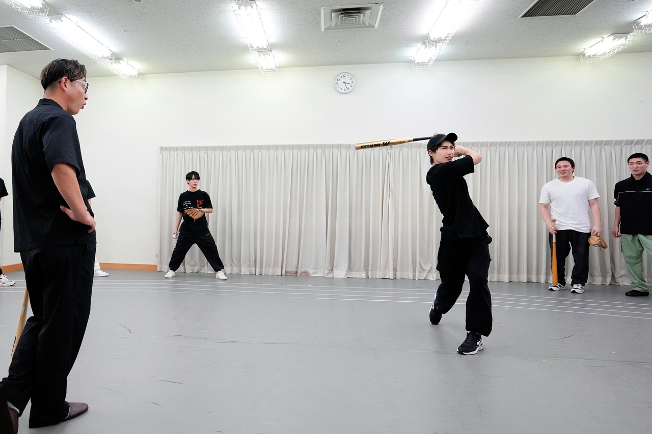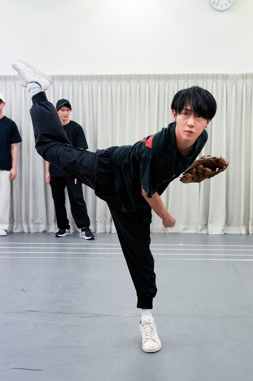 場面披露後には、野球練習の様子も公開。藤井、岡﨑を中心とした野球シーンに参加するメンバーが順番にバッティング、ピッチングの様子を見せると、野球監修の今成亮太がフォームを指導します。今成からグッドサインで称えられた岡﨑のバッティング、野球未経験ながらエースピッチャー役として練習を重ねた藤井のピッチングに周囲からも歓声が上がり、今成は「最初はどうなることかと思いましたが、成長しました!」と太鼓判を押しました。