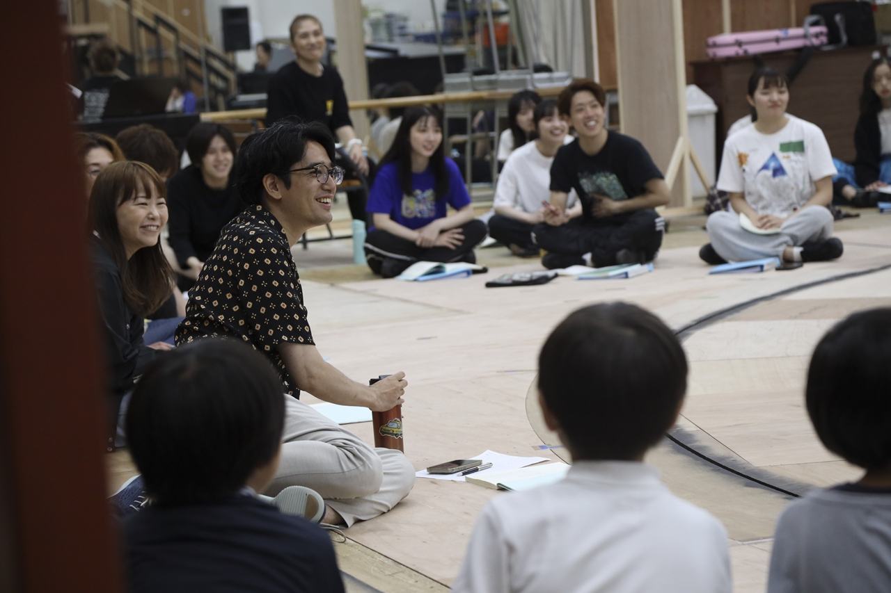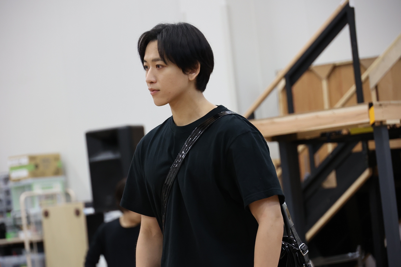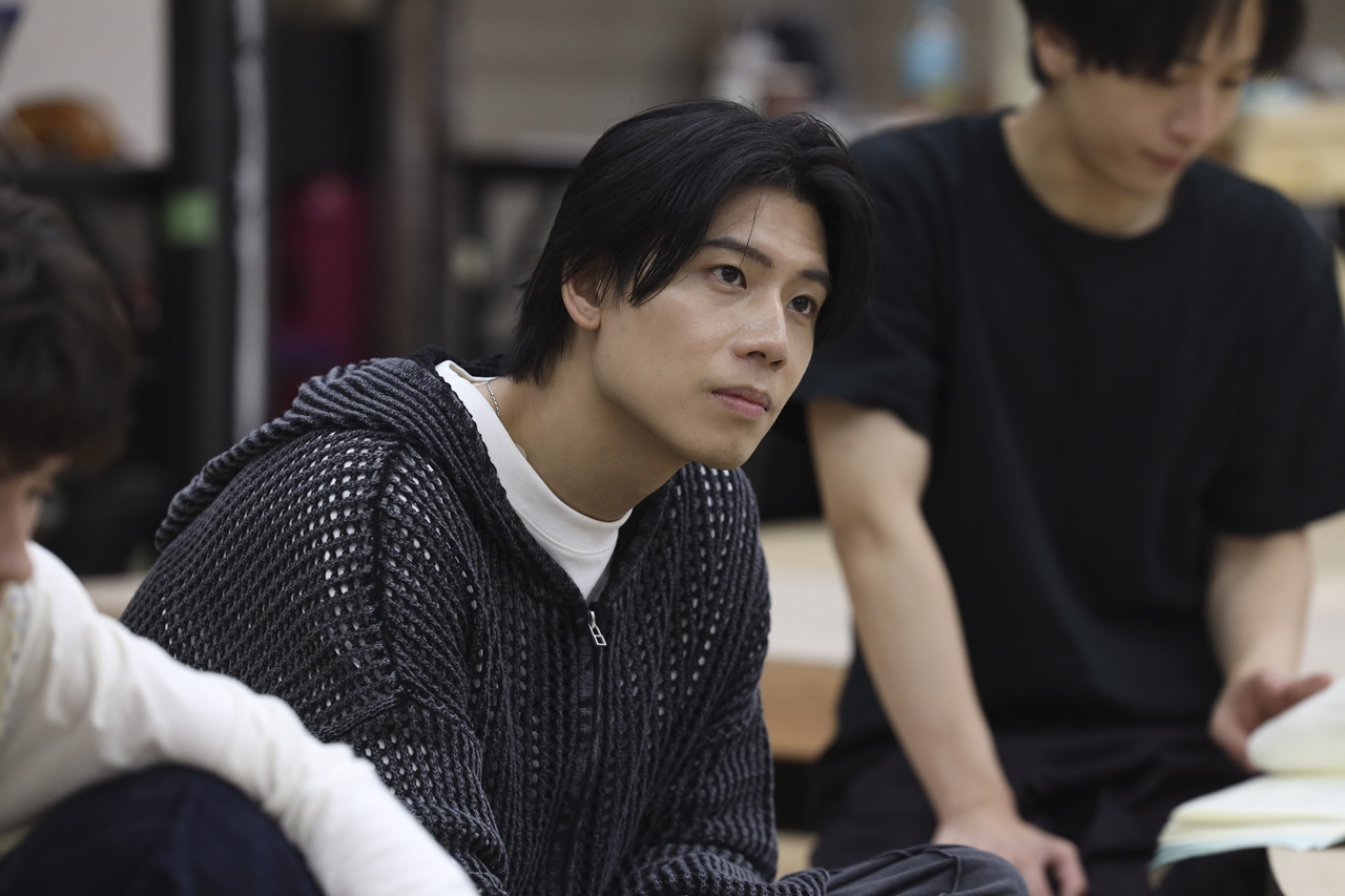 全員が広がっての発声練習を終えると、いよいよ通し稽古。演出の上田一豪が「一幕の最後まで繋げてやると見えてくること、チャレンジできることの発見があると思うので、遠慮せずに色々な表現を試してやってみてください。自分はこうやりたいという欲求が舞台上にたくさんあったほうが、エネルギーのある作品になっていくので」と語ると、皆の目に強い力が宿っていきます。