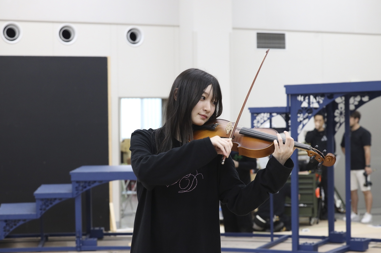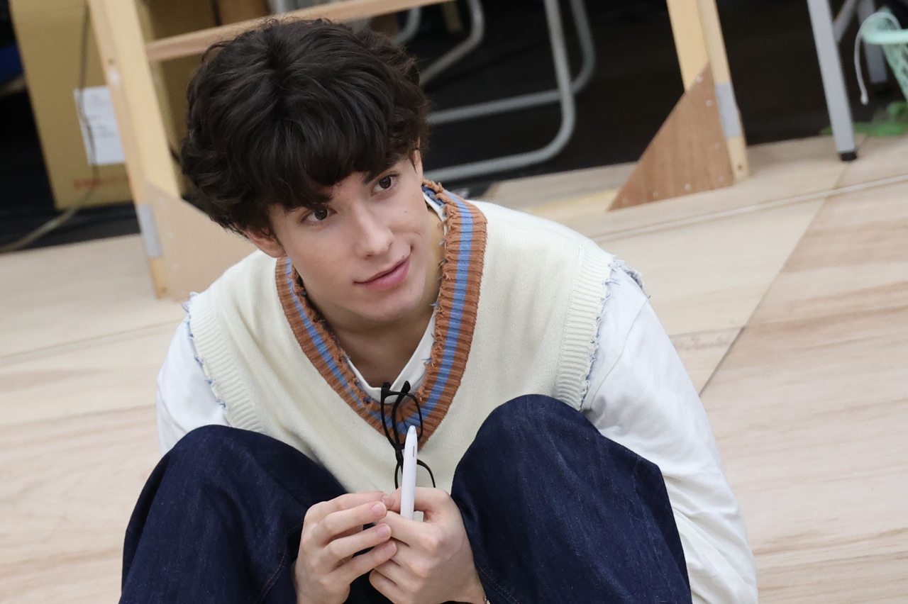 冒頭の公生のソロ「僕にピアノが聞こえないなら」で、岡宮の繊細な哀しみを含んだ歌声が響くと、それまで和やかだった稽古場の空気が一変し、作品世界が立ち上がってきます。岡宮の佇まいから孤独を抱える公生が現れ、それを見つめる東島はじめ周りのキャストの真剣な表情も印象的でした。対して、明るく元気な椿が登場すると、空気の色ががらりと変わり華やかに。希水は友人を思いやる心が滲み出る優しい椿を体現。自分自身が気がついているのかいないのか、かをりに眼差しを向ける公生を見守る表情がなんともいえず胸を打ちます。島が演じる渡はいかにも学校一の人気者。真っ直ぐに育ってきた気持ちのいい明るさをまとっています。だからこそ、高校最後の試合を終えた後の「The Beautiful Game」の歌声が強く刺さります。その親友三人に大きな影響を与える個性的なかをり。エネルギッシュで快活でありながら、周りには打ち明けられないことを秘めている女子高校生という難しい役どころを、加藤は持ち前の美しい声、姿勢で表現していきます。はかなくも強いかをりを感じさせました。