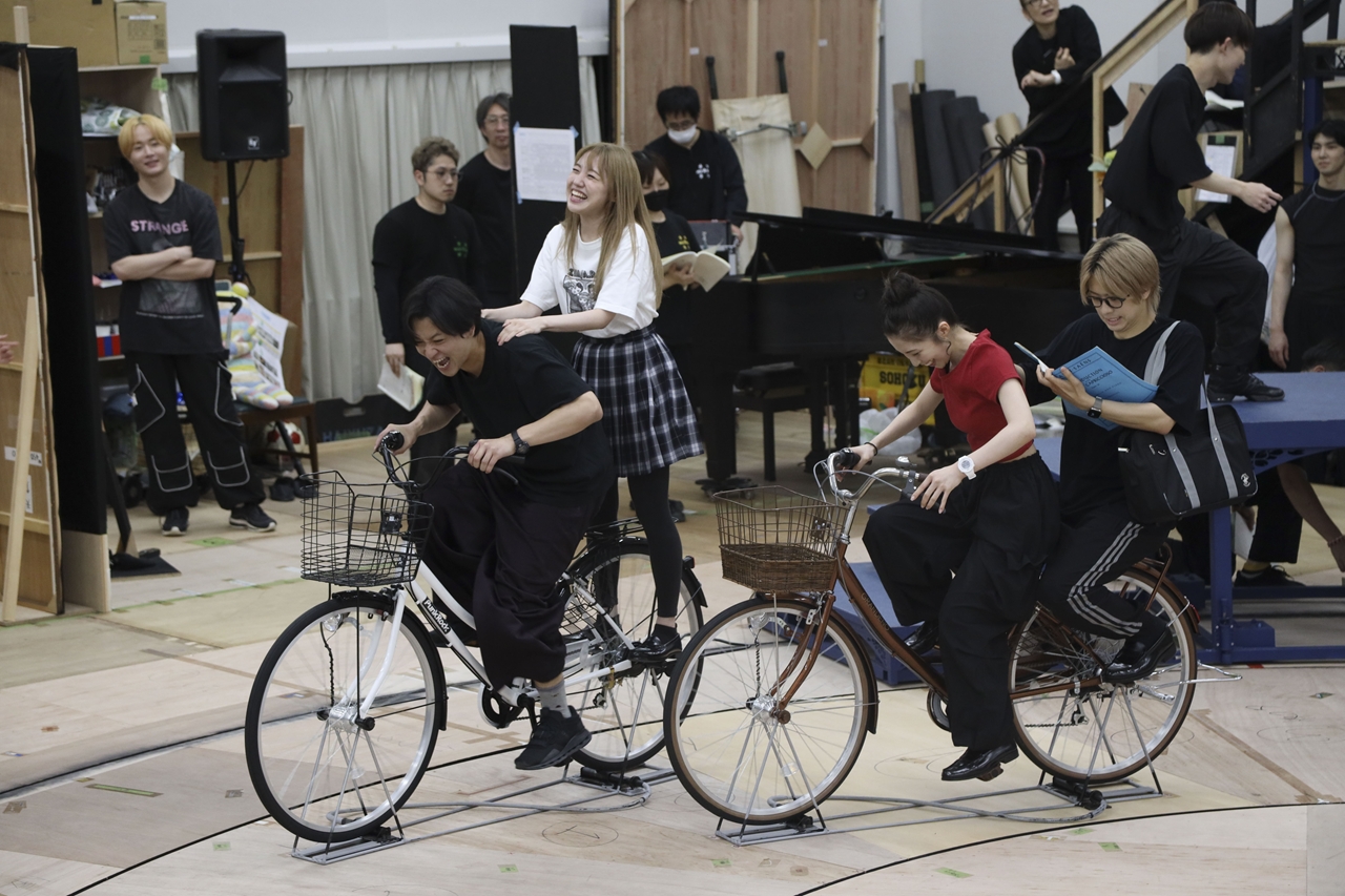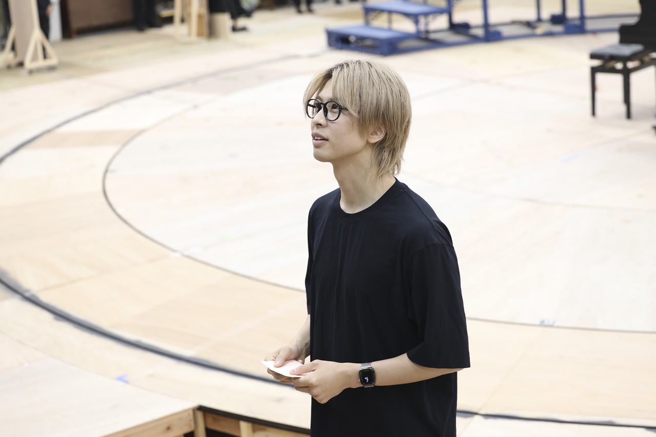 アンサンブルもそれぞれが生き生きと作品世界に入り込み、公生、かをり、椿、渡の 4 人の日常の学校生活の空気まで感じさせる通し稽古。かをりのソロ「旅に出よう」で一幕が終わり、全員を集めた上田一豪は「すごいです!」と第一声。「こうやって繋げていきながら修正をかけていきますが、セットが階段しかない舞台なので、いかに人が空気と時間を作っていくかが大事です。原作の漫画は読んでいる人がページをめくるけれど、舞台ではみんなで一緒にページをめくっていく作業が必要。本のようにめくり返したりできないので、物語を運んでいく時に、その場でどこまでの情報をお客様に伝えていくかも重要。演じる側が、毎回新鮮にその瞬間を生きていることがお客様に伝わっていくので、その新鮮さを10月まで味わい続けて、深めていけたらいいなと思います」と語りました。