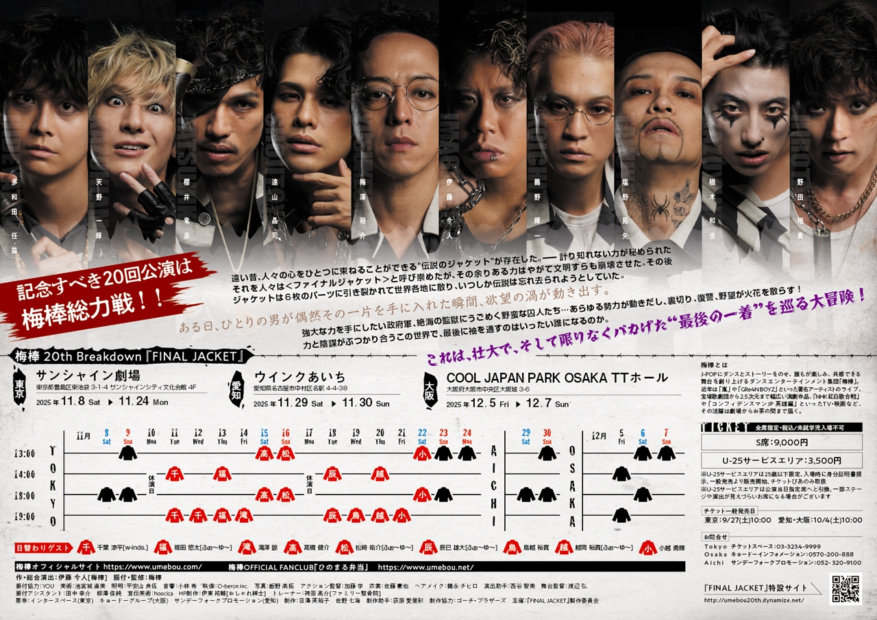 2025年11〜12月にサンシャイン劇場、ウインクあいち、COOL JAPAN PARK OSAKA TTホールで上演される注目の最新作、梅棒 20th Breakdown『FINAL JACKET』の公演詳細が公開されました。