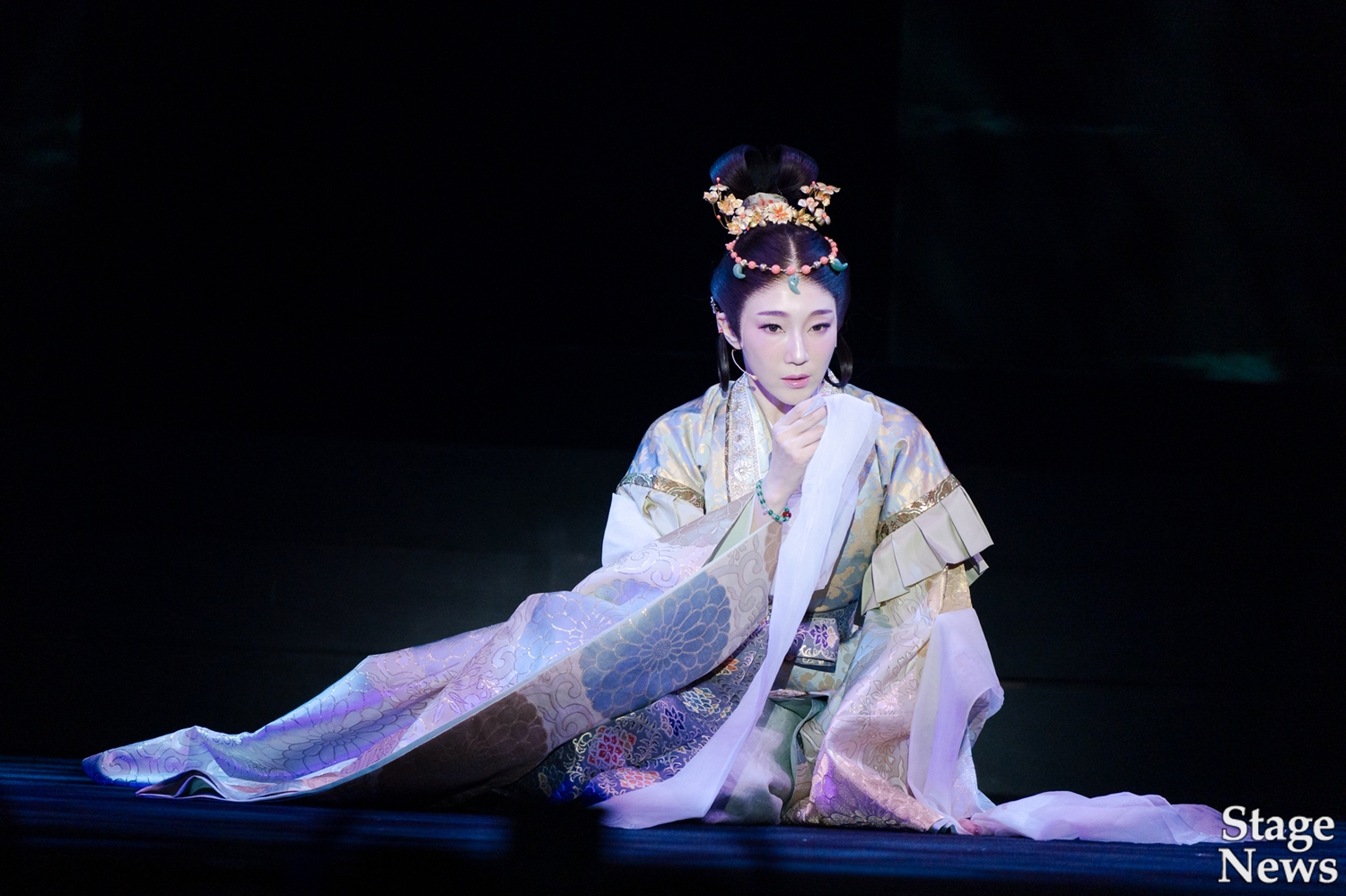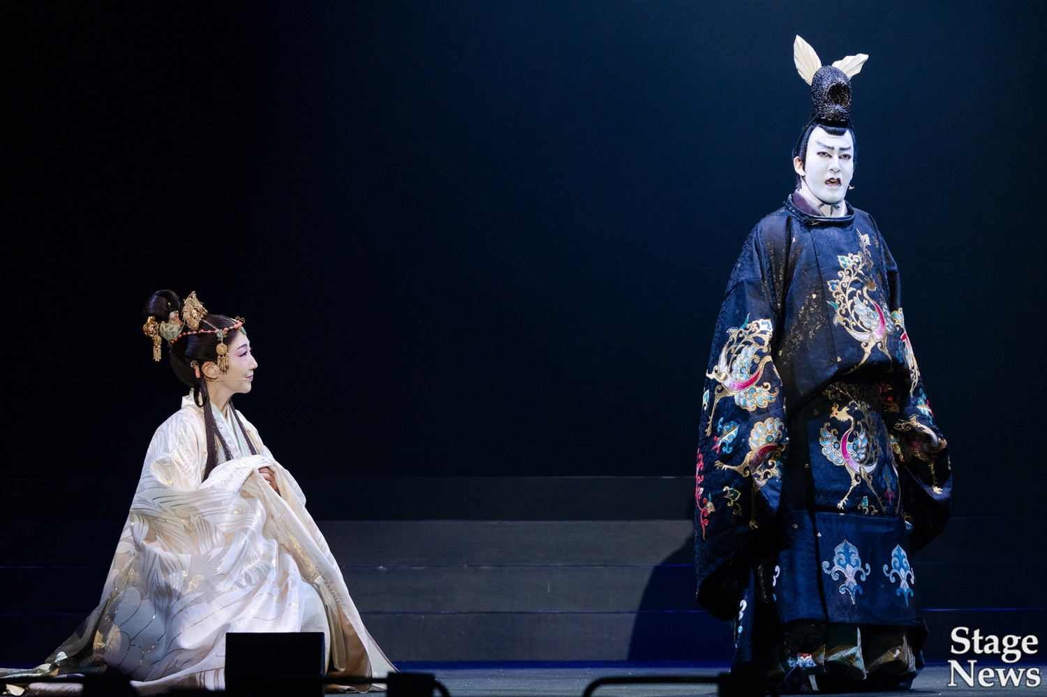 紅ゆずる:私の中では大変短いお稽古期間でしたが、集中して頑張ってきました。この素晴らしい方々と共演させていただくことを大変嬉しく思っております。そして、皆様の年の終わりの大切な時間をお借りいたしまして、舞台に足をお運びいただけることを嬉しく思っております。この装束を着てみて、守られているという感覚より、背負っているという感覚の方が強く、装束のひとつひとつの所作も意味を持たせたいと考えています。お稽古中、袖をどうしたらいいのか悩んでいたら、右近さんから「この衣装を自分が操るんだと思わなきゃダメですよ!」と素晴らしいお言葉を頂きました。その通りだと思い、自分で操ってやる!と思って頑張っております。精一杯、力一杯頑張りますので、よろしくお願いいたします。