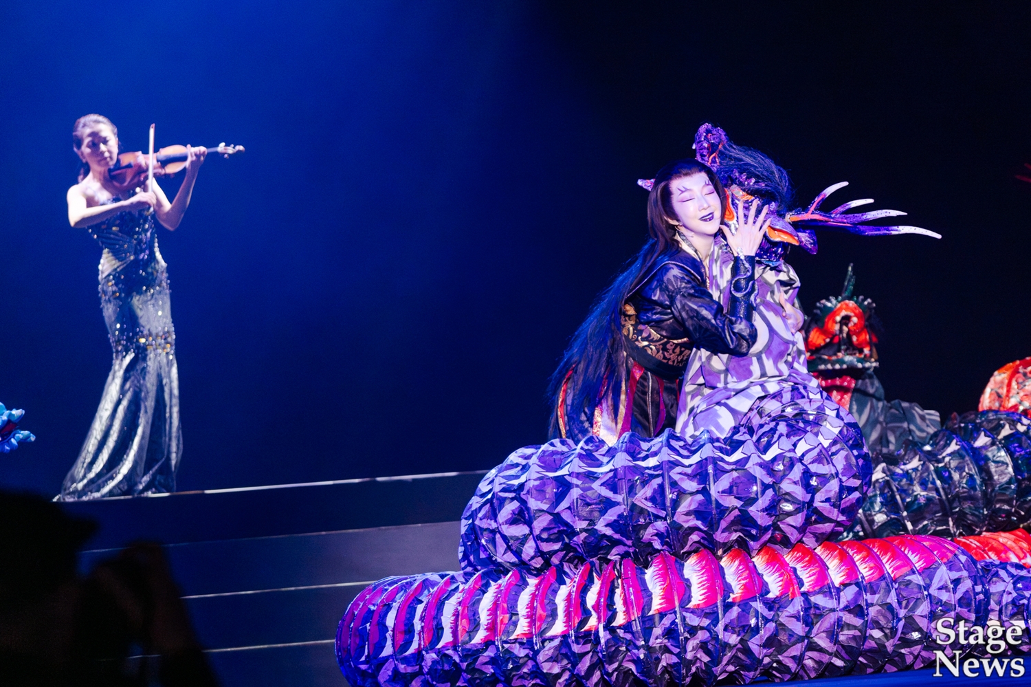 出演は、須佐之男役に尾上右近。岩⻑姫役に紅ゆずる、瓊瓊杵尊役に佐藤流司、伊邪那岐命役に和⽥琢磨、⽊花咲耶姫役に梅⽥彩佳。そしてヴァイオリンの川井郁⼦と和楽器が奏でる⾳⾊、⽯⾒神楽 万雷の⼤蛇の舞が本作を彩ります。