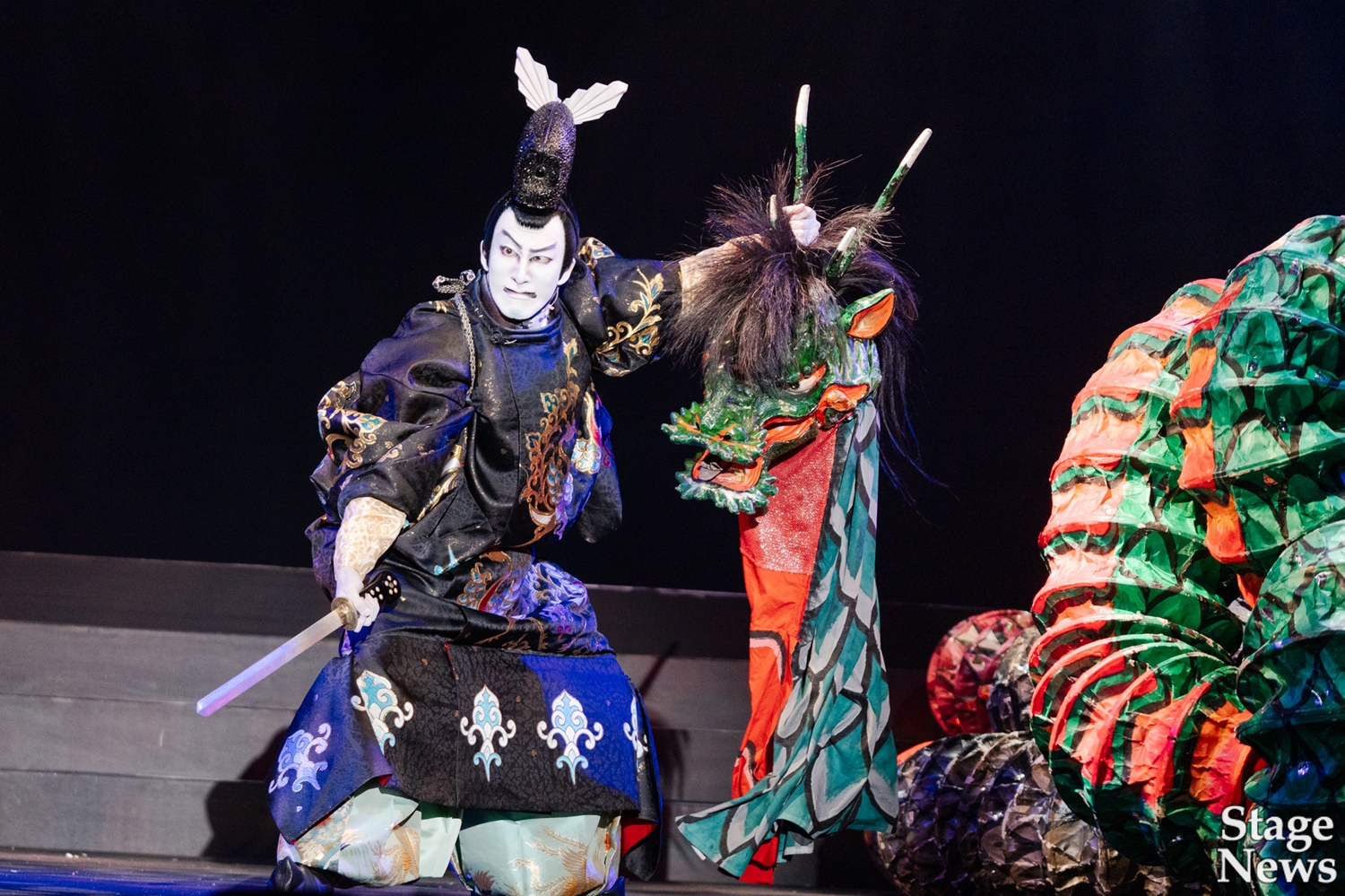 そして、イザナキとイザナミの国生み、神産みを描いてゆく神秘的な幕開けより、黄泉へと去った母イザナミの穢れを濯いで生まれたスサノオが、舞台上で衣裳を纏い、隈を取り、大太刀を持って歌舞伎の荒事を見せ、荒む魂、荒御魂を現して天上へと踊り込みます。