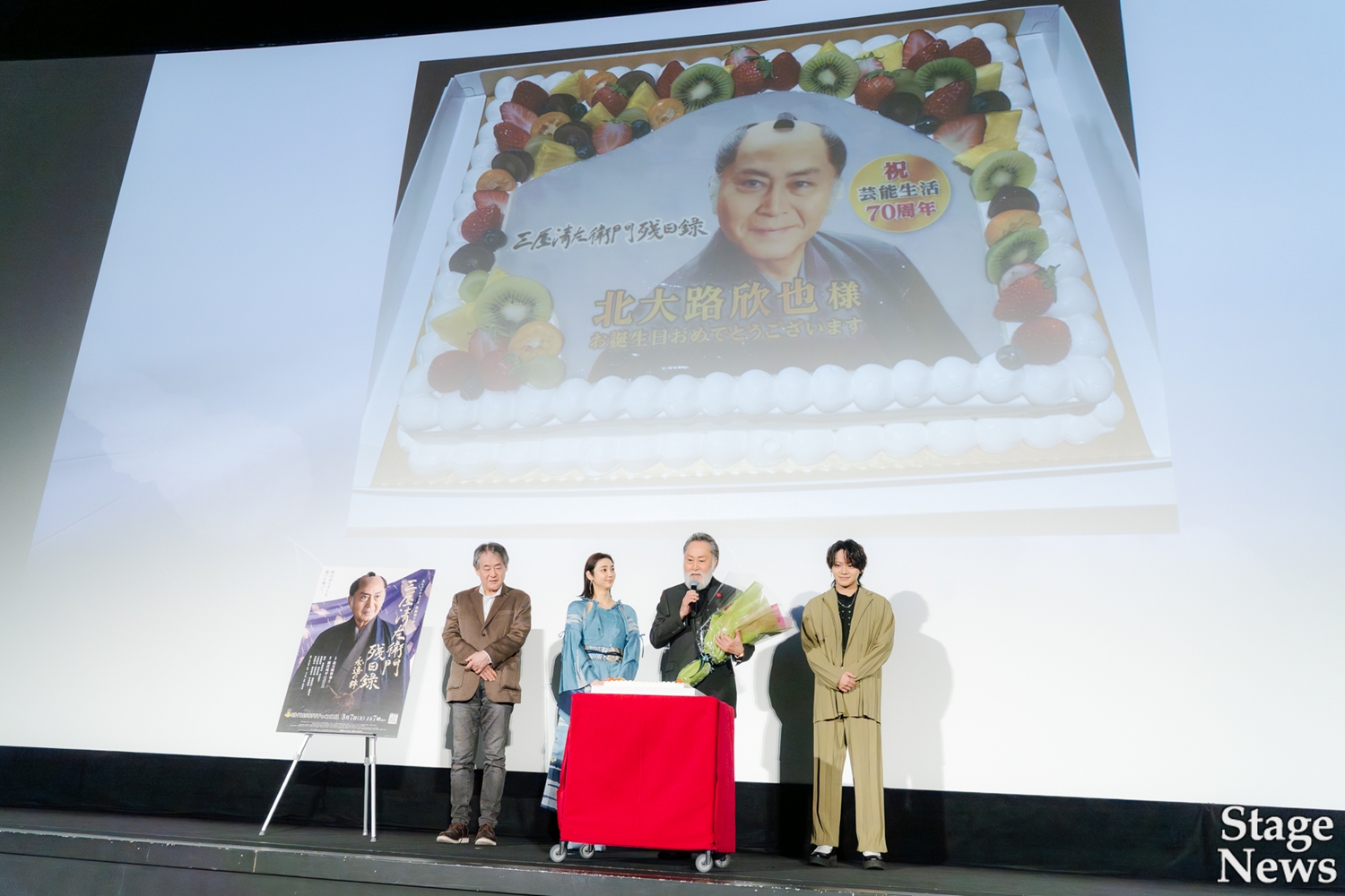 そしてフォトセッションの前には、2月23日に83歳を迎える北大路にサプライズが実施され、登壇者より花束とケーキが贈られた。